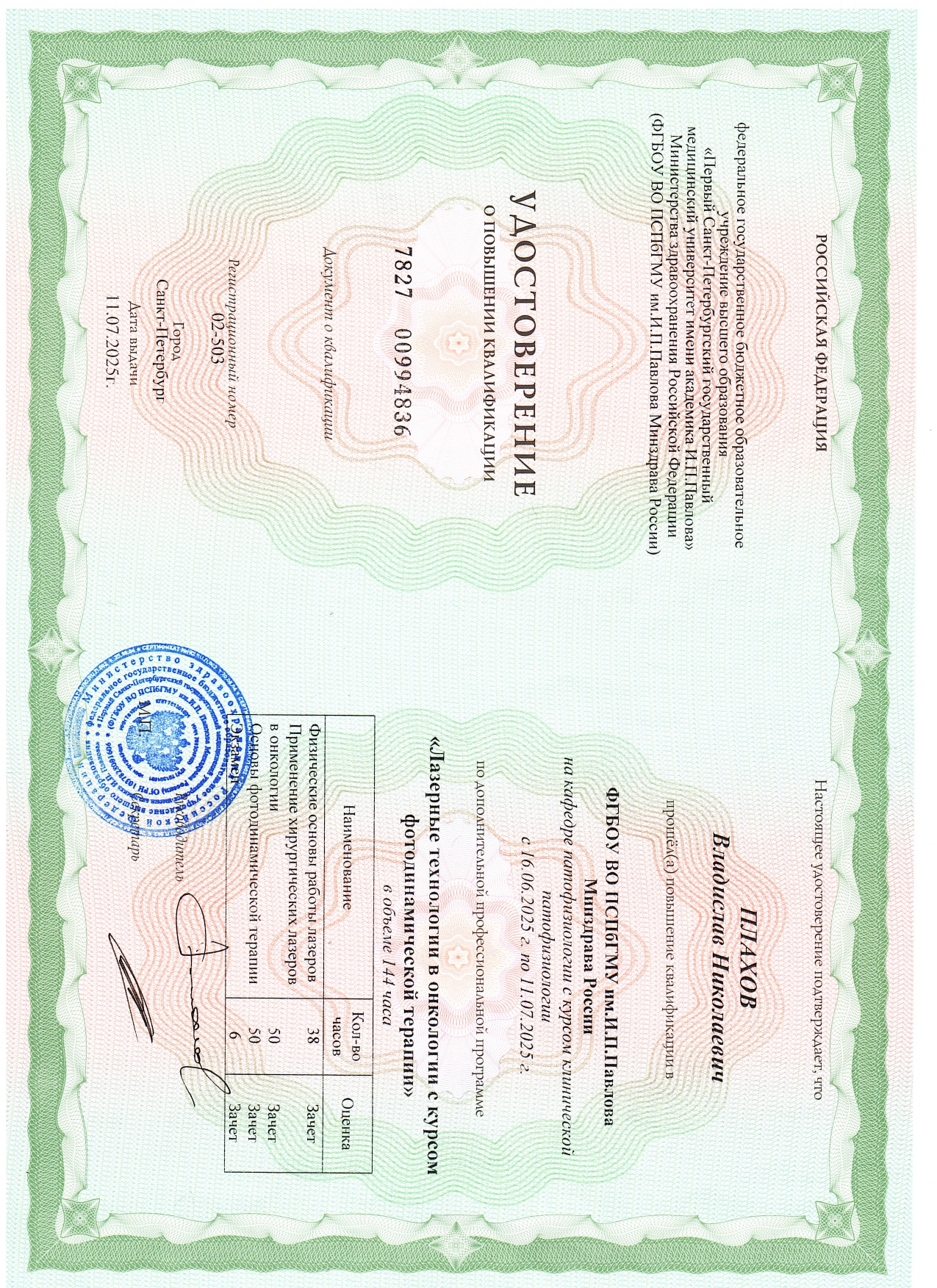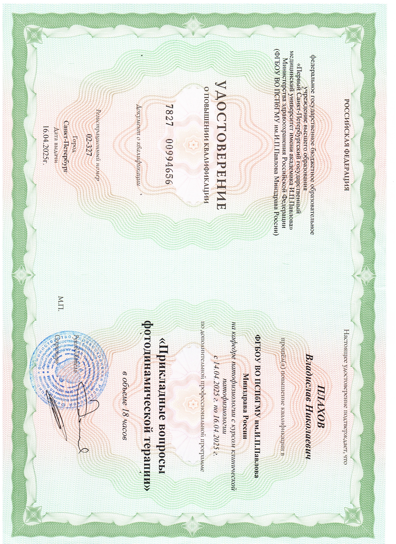 - Интернатура по специальности "Анестезиология и реанимотология", Учреждение образования «Витебский государственный ордена Дружбы народов медицинский университет» (2013г.)
